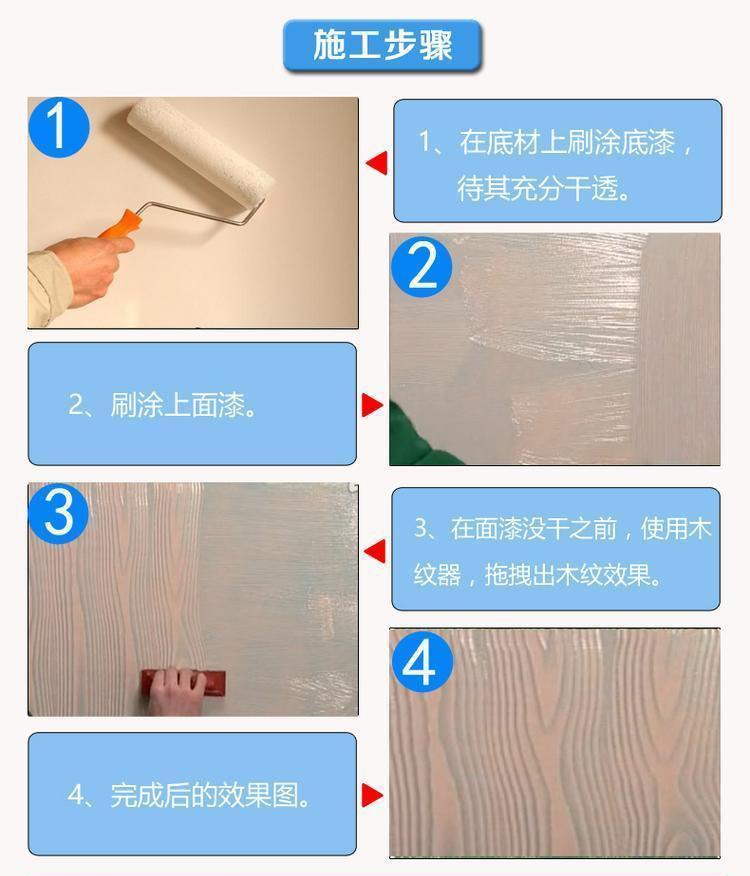 4、可呈現(xiàn)各種木紋狀藝術(shù)圖案,圖案隨意、細(xì)膩、無(wú)接縫、不起皮、不開裂,底色和面色可以自由搭配,圖案可任意創(chuàng)作。古色古香,壽命長(zhǎng);